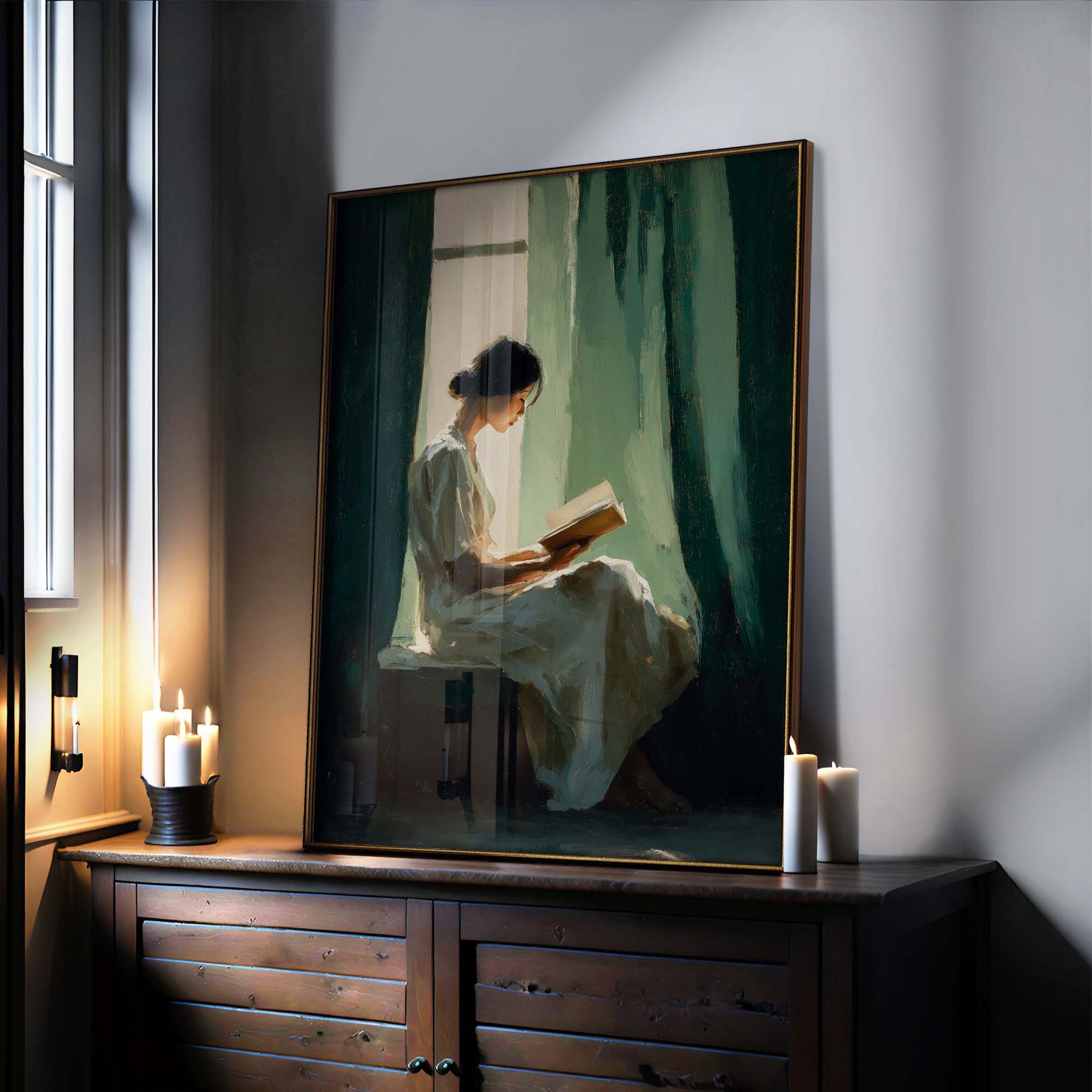 A tranquil composition featuring a young woman reading while nestled among green flowing curtains, soft sunlight and quiet focus - perfect for peaceful interiors.