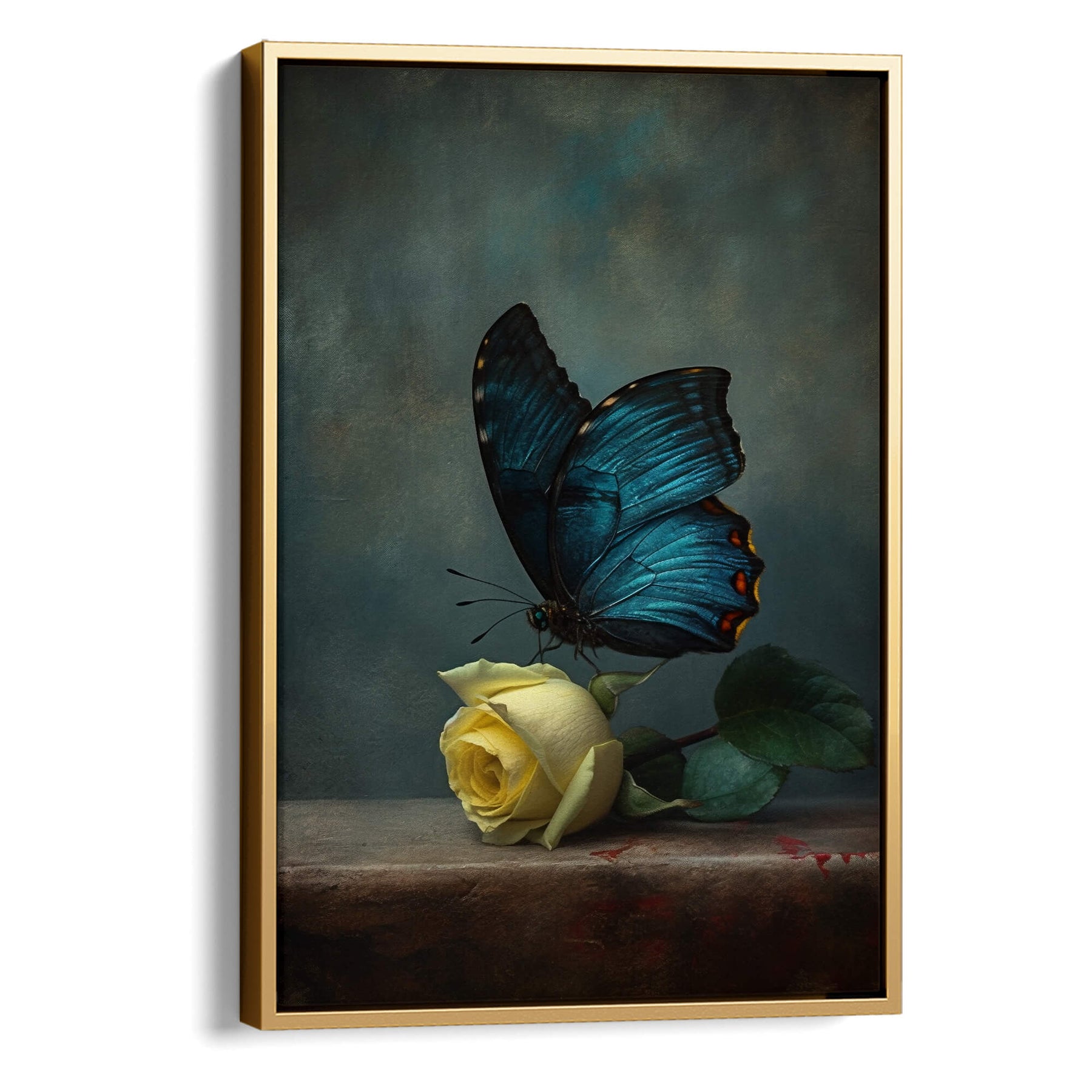A dramatic print featuring a deep blue butterfly with a single yellow rose, set against a softly textured, moody backdrop. The gothic style, rich tones and fine detail give it a timeless, almost painterly feel.